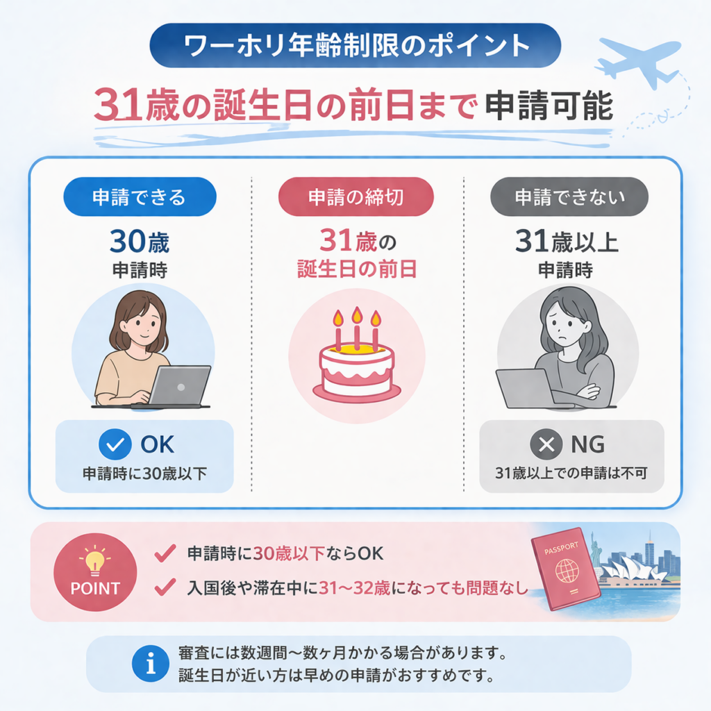 申請時に30歳以下 → OK(入国時・滞在中に31〜32歳になっても問題なし)
