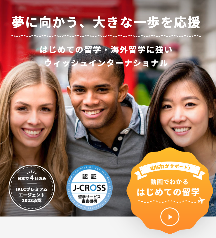 ウィッシュインターナショナルは1987年創業の老舗留学エージェントです。世界10か国22都市に現地サポートオフィスを展開しており、渡航後のトラブル対応や生活サポートの手厚さに定評があります。